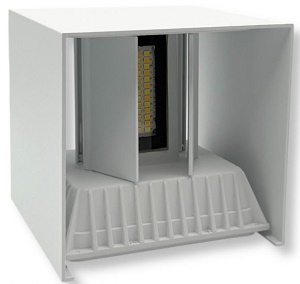Applique con corpo illuminante LED da 22W integrato e tecnologia LED SMD. Doppia sorgente luminosa con copertura trasparente ed alette regolabili. Forma cubica di design realizzata in metallo di colore bianco. Fascio luminoso regolabile e flusso luminoso di 2000lm. Alta luminosità e rapporto di 90 lm/W. Grado di protezione IP65 per utilizzo esterno. CCT 3in1 settabile a: Luce Bianca Calda 3000K, Naturale 4000K e Fredda 6500K.