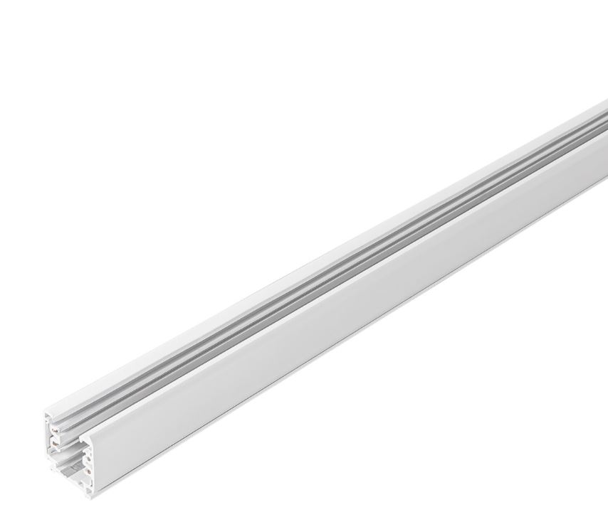 binario elettrificato trifase in alluminio di 3 metri di lunghezza, con finitura bianco satinato, progettato per sistemi di illuminazione a binario.