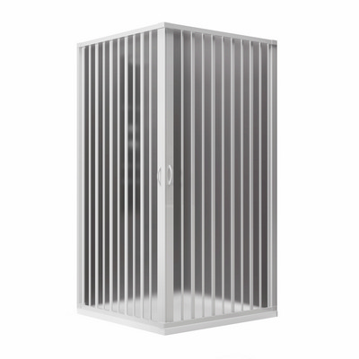Box doccia due lati, angolare, chiusura centrale. Altezza cm 185. Struttura in PVC durevole nel tempo. Giunto snodabile. Chiusura portamaniglia. Ignifugo – Classe1. Adattabile.