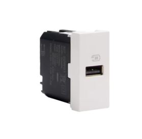 Caricatore USB con una porta tipo A per la ricarica di dispositivi elettronici fino a 15W. Tensione di uscita: 5 Vd.c. – alimentazione DIRETTA 100-240 V 50-60 Hz – 1 modulo – bianco