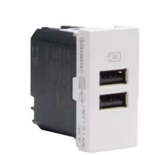 Caricatore USB con due porte tipo A per la ricarica di un singolo dispositivo elettronico fino a 15W o di due dispositivi in simultanea. Tensione di uscita: 5 Vd.c. – alimentazione DIRETTA 100-240 V 50-60 Hz – 1 modulo – bianco