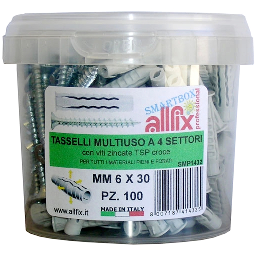 100 TASSELLI F4 MULTIUSO IN NYLON 6×30 mm CON VITI ZINCATE TSP CROCE 4,5×40 mm