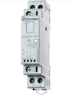 Contattori modulari N°contatti: 2 NO Materiale contatti: AgSnO2 tensione d’esercizio nominale: 250 V. carico max. lampada a incandescenza: 2000 W. carico max. della lampada fluorescente: 500 VA. tipo di tensione di azionamento: AC/DC tensione di azionamento nominale: da 176 a 264 V. tipo di tensione d’esercizio: AC corrente d’esercizio nominale: 25 A. dispositivi supplementari possibili: si Grado di protezione: IP 20 Optional: Indicatore meccanico + LED Accessori: Supporto perfissaggio a pannello; pettine 8 poli