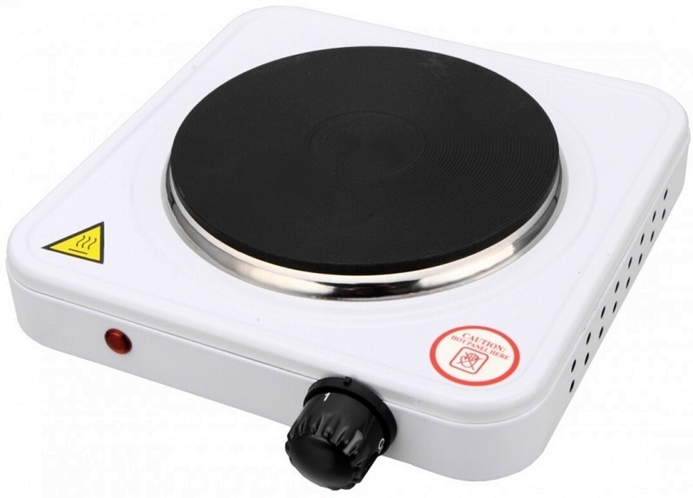 in metallo, piastra in ghisa. Termostato regolabile. Spia luminosa di controllo.
