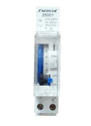 Interruttore orario giornaliero, alimentazione 220 VAC amperaggio 16A max. Programmazione 24 ore 1 modulo din Intervento minimo 15 minuti Batterie incluse Grado di protezione IP20.