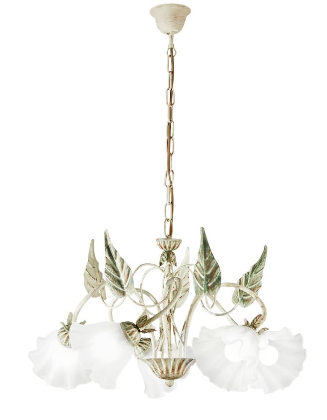 - Stile: Caratterizzato da un design classico con foglie in metallo (avorio o tortora, a seconda della finitura) e paralumi/diffusori in vetro bianco.