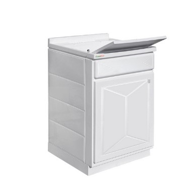 Lavatoio in polipropilene. Articolo già assemblato, completo di sifone, asse coprivasca, cerniere in metallo e piedini regolabili. H. 87 cm. Profondità vasca 25 cm. Vasca forabile per installazione rubinetto.