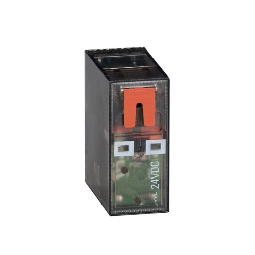 Mini Relè Lovato, corrente nominale 8A, 2 scambi, tensione di comando 24VDC, con indicatore LED dello stato e azionatore meccanico. Montaggio su zoccolo HR5XS2(vedi accessori).