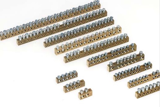 morsettiera in ottone con viti, progettata per la connessione di cavi elettrici.