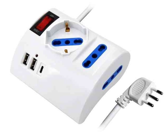 La multipresa CFG ES066 offre una soluzione compatta per collegare dispositivi con diverse tipologie di spine e ricaricare dispositivi elettronici tramite porte USB.