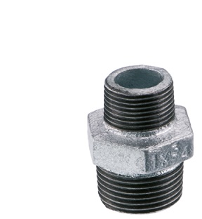 raccordo filettato maschio-maschio in ghisa malleabile, ideale per collegare tubazioni di diametri diversi.