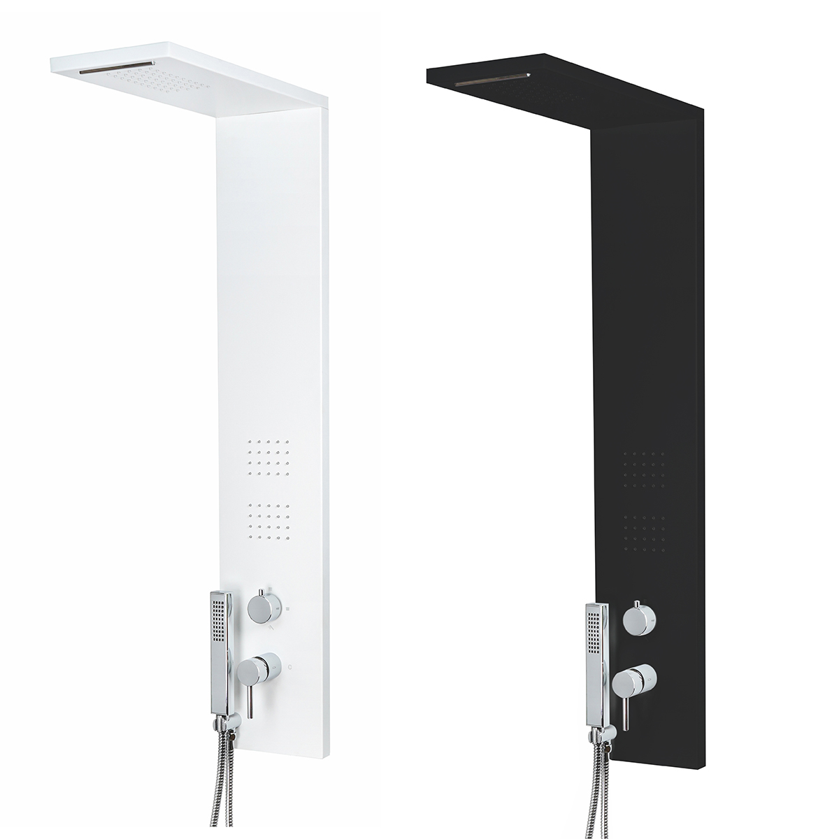 Parete attrezzata con 4 funzioni selezionabili: soffione, getto effetto cascata, doccetta e getti orizzontali massage, flessibile in acciaio inox doppia aggraffatura estensibile cm 150-200. Pressione minima 1,5 bar. Dimensioni di ingombro: Larghezza 20 cm, altezza 110 cm, profondità 50 cm; Materiale : Acciaio Inox AISI 304 – Alluminio verniciato.