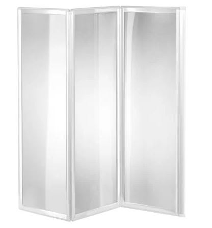 sopravasca in acrilico con tre ante ripiegabili a soffietto, profili in alluminio bianco e lastre in polistirene satinato.