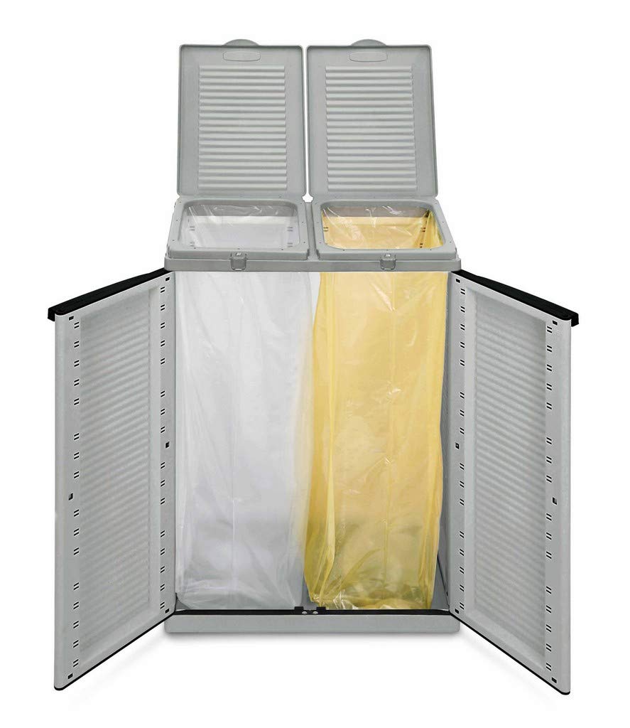 Contenitore dotato di due porta-sacco da 110 litri, chiudibili con coperchio.