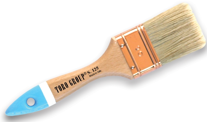 pura setola bionda, manico in legno verniciato, ghiera ramata. Larghezza 70 mm