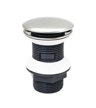 Piletta Click-Clack fornita di fabbrica senza troppopieno, ma convertibile in piletta con troppopieno. Materiali: corpo piletta in plastica, con anello e tappo in acciaio inox.
