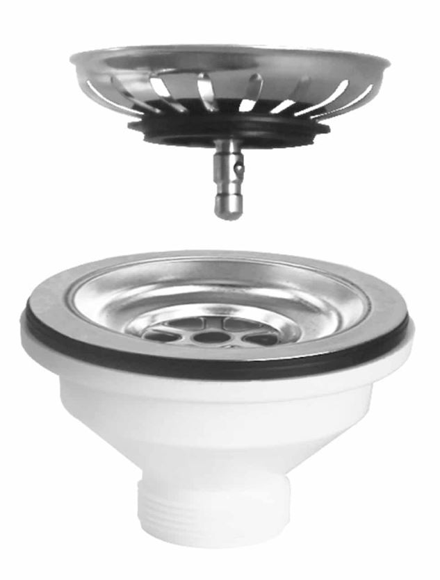 - Materiali: Il corpo principale è solitamente in polipropilene bianco (plastica), mentre la flangia (la parte che appoggia sul fondo del lavello), il cestello, la vite e il pomello sono in acciaio inox, spesso di tipo AISI 304 (18/10), noto per la sua resistenza alla corrosione e igiene.