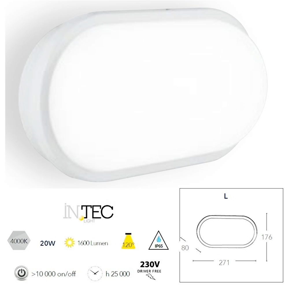 plafoniera/applique LED ovale da esterno di colore bianco prodotta da Intec Light, con grado di protezione IP65 che la rende resistente all’acqua e adatta per l’uso in ambienti esterni.
