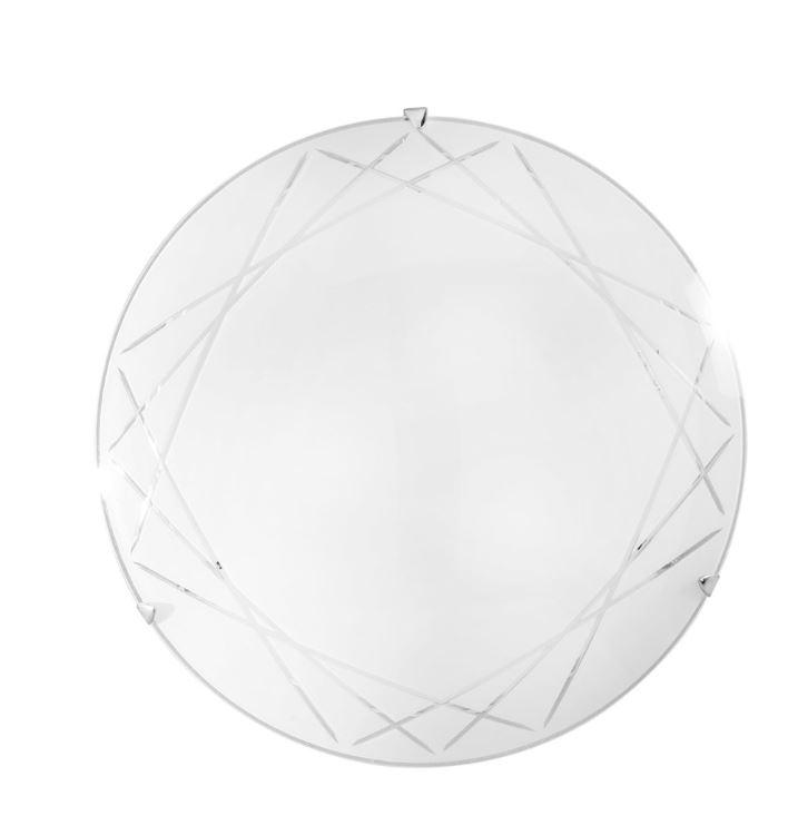 La plafoniera presenta un design moderno ed elegante, caratterizzato da un diffusore in vetro satinato bianco con decori incisi e ganci cromati.
