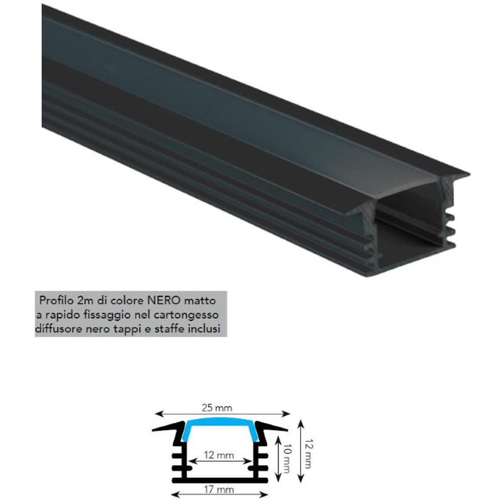 profilo in alluminio per strisce LED da 2 metri, prodotto da Intec (marchio Fan Europe), di colore nero (NER), specificamente progettato per montaggio a incasso nel cartongesso (perfetto per creare tagli di luce diffusa, con bordi minimi sporgenti). Viene venduto completo di diffusore opaco (nero), tappi e staffe di fissaggio, ideale per illuminazione decorativa in vari ambienti come negozi, uffici, cucine e scaffali, nascondendo i singoli LED per una luce uniforme.