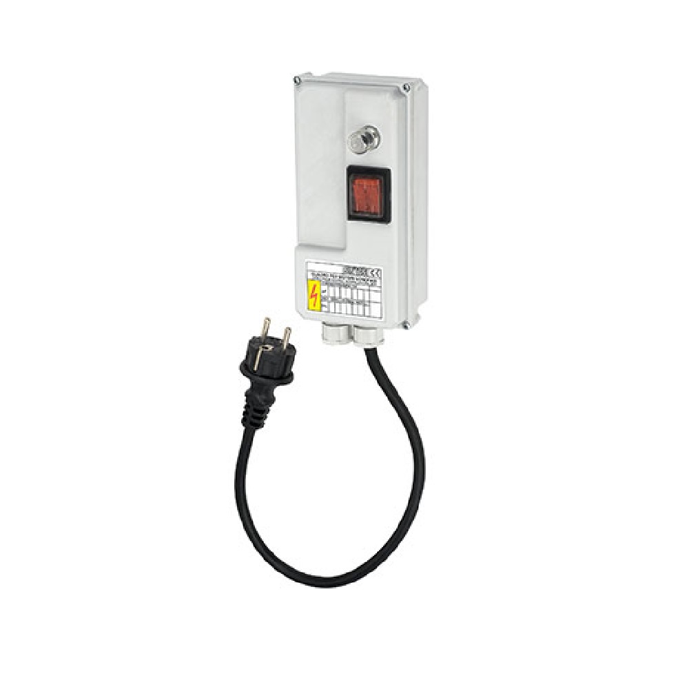 Per elettropompe sommerse monofase. Scatola in materiale termplastico antiurto con due passacavi. Interruttore generale bipolare luminoso. Protezione IP43. Condensatore di avviamento. Protezione termica con riarmo esterno manuale.