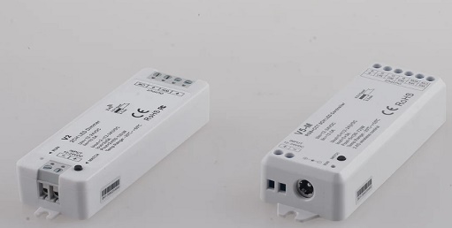 ricevitore a radiofrequenza (RF) a 5 canali utilizzato per il controllo di strisce LED, compatibile con vari tipi di illuminazione come colore singolo, CCT, RGB, RGBW e RGB+CCT. È un dispositivo professionale per sistemi di illuminazione che supporta diverse tensioni di alimentazione.